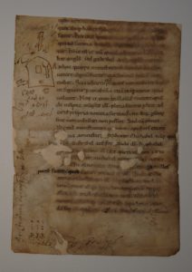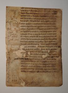 La cubierta original aprovechaba como tapa flexible un pergamino, que fue retirado por los restauradores y sustituido por una tapa moderna. El pergamino es el fragmento de un códice del siglo XII, en escritura carolina, que contenía las XL Homiliae in Evangelia de Gregorio Magno (in evang. 34, 7-9). Sobre ese manuscrito, en lo que funcionaba como la tapa interior de la cubierta delantera, hay diversas anotaciones del siglo XVI, y entre ellas una de posesión: «Jo. Francisci Cataniaran (?) liber» – Uno de los fragmentos de refuerzo recuperados se extrajo probablemente del mismo códice de las Homiliae de Gregorio (in evang. 31, 1 y 39, 10; con una elegante y ornada letra capitular).